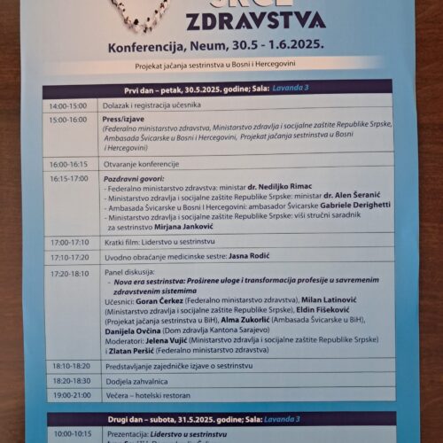 Federalno ministarstvo zdravstva i Ministarstvo zdravlja i socijalne zaštite Republike Srpske, u saradnji s Fondacijom fami organizovali su Konferenciju ‚‚Sestrinstvo – srce zdravstva‘‘, posvećenu unapređenju sestrinske profesije, koja se održava u periodu od 30.05-01.06.2025. godine u Neumu.