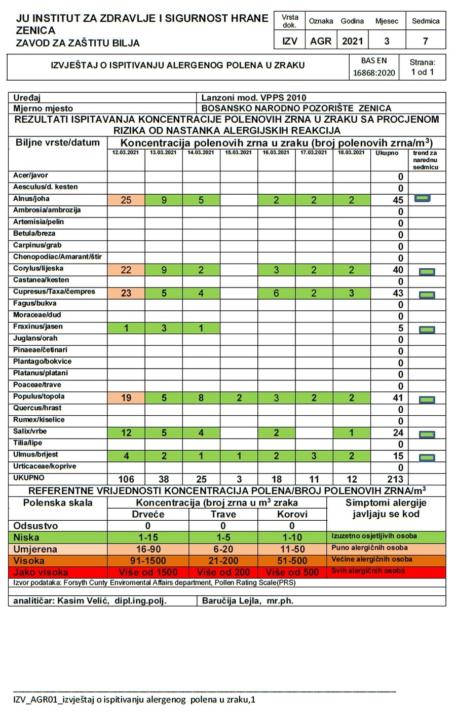 Izvještaj o ispitivanju alergenog polena u zraku od 12. do 18.03. 2021.