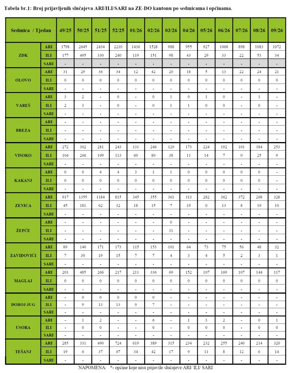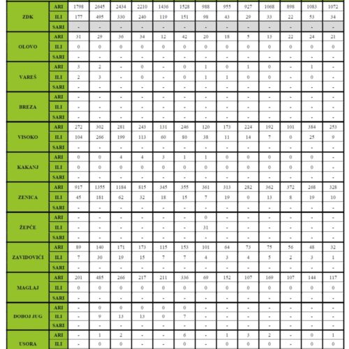 Podaci se sedmično dostavljaju Službi za epidemiologiju, Instituta za zdravlje i sigurnost hrane Zenica, iz zdravstvenih ustanova Zeničko-dobojskog kantona.
