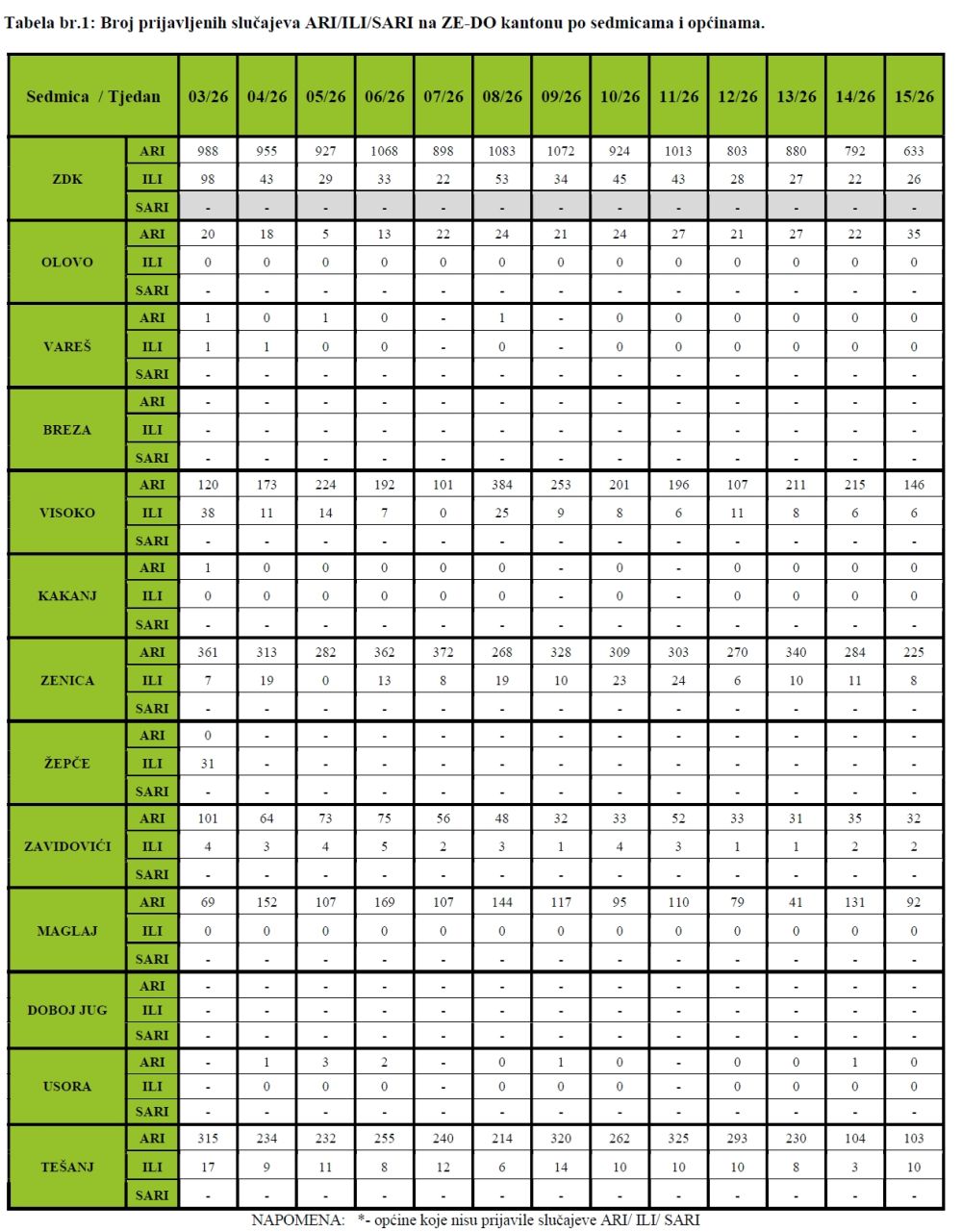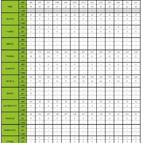 Podaci se sedmično dostavljaju Službi za epidemiologiju, Instituta za zdravlje i sigurnost hrane Zenica, iz zdravstvenih ustanova Zeničko-dobojskog kantona.