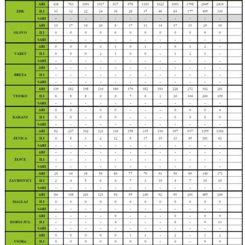 Podaci se sedmično dostavljaju Službi za epidemiologiju, Instituta za zdravlje i sigurnost hrane Zenica, iz zdravstvenih ustanova Zeničko-dobojskog kantona.