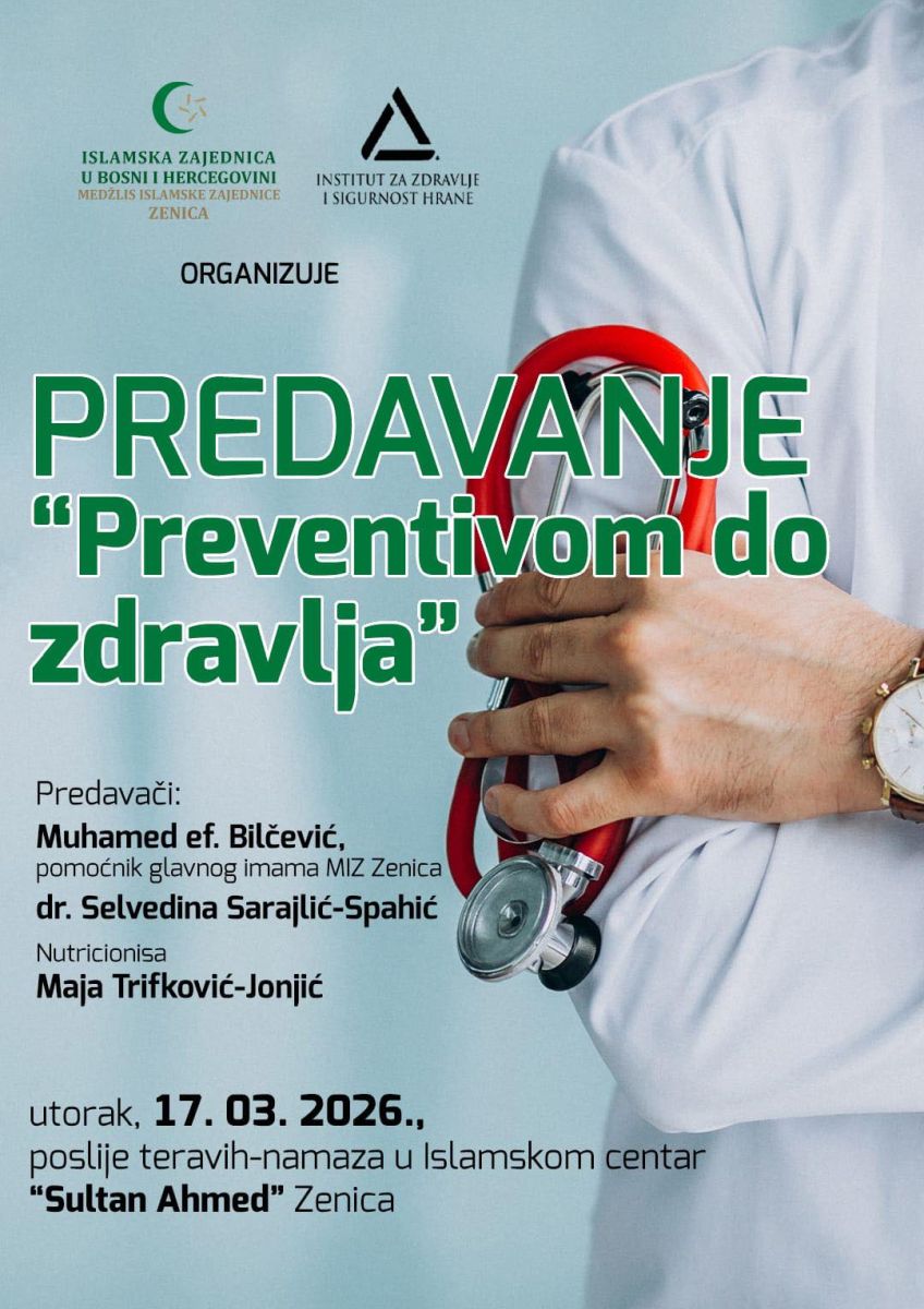 U okviru ranije uspostavljene saradnje između Instituta za zdravlje i sigurnost hrane Zenica (INZ) i Medžlisa Islamske zajednice Zenica (MIZ), realizovana je jedna od planiranih aktivnosti, javno- zdravstveno predavanje posvećeno važnosti prevencije i očuvanja zdravlja.