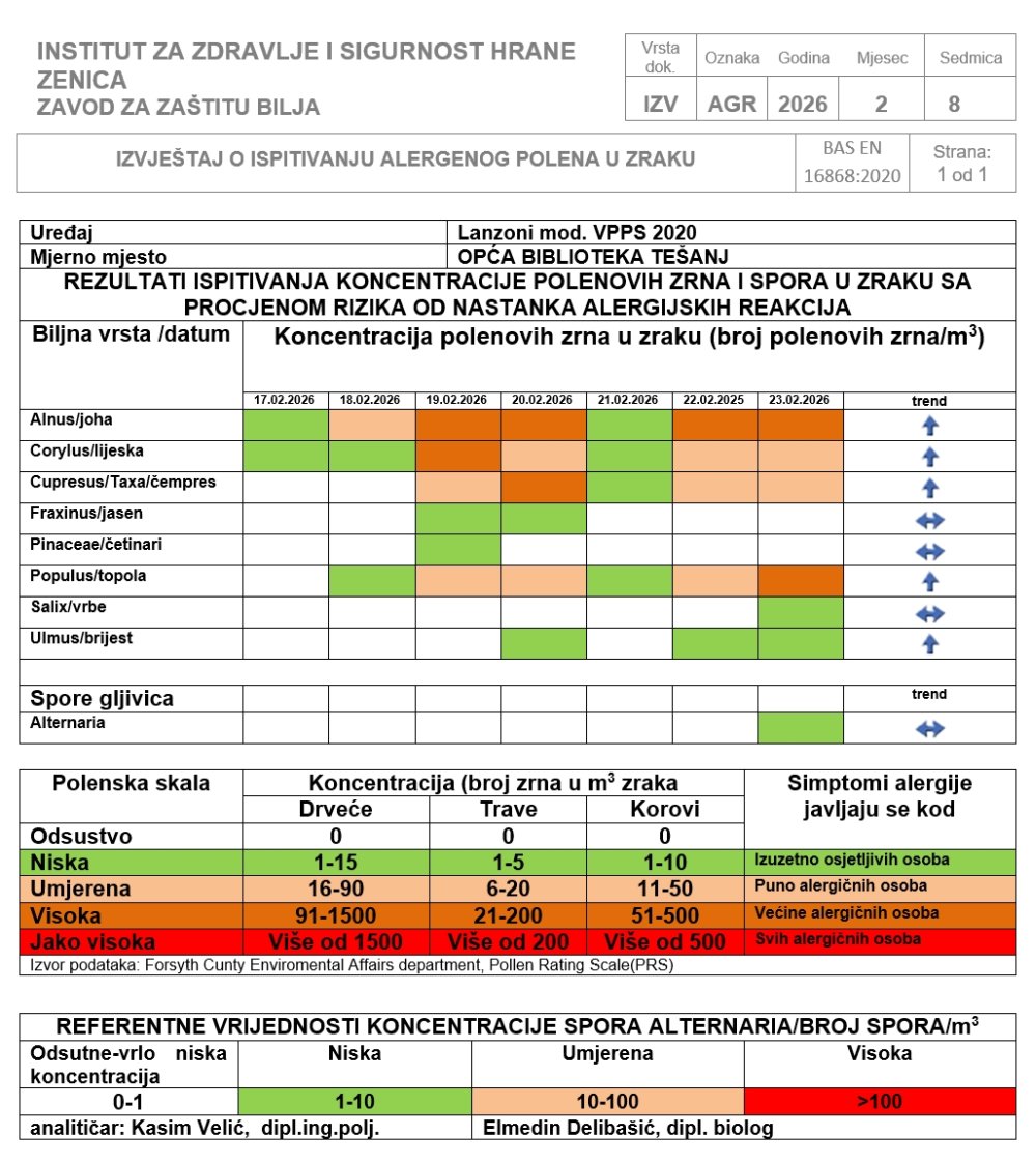 Podaci sa mjernih stanica za polen Tešanj, Zenica i Visoko ponedjeljak, 09. Februar 2026. -…