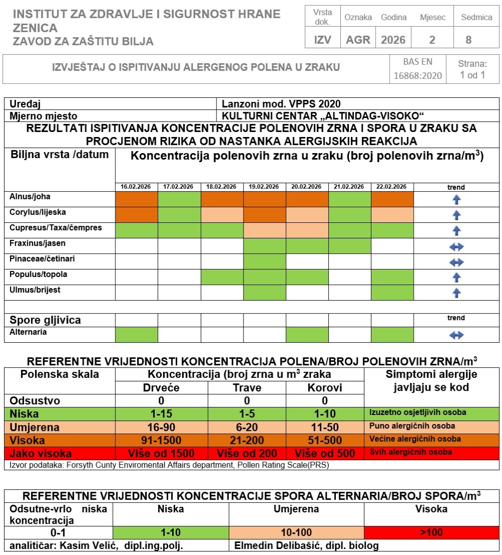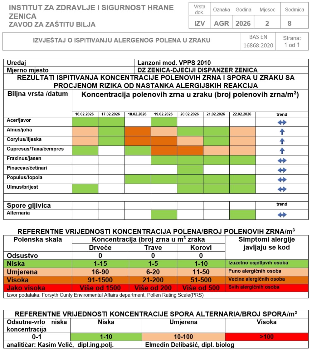 Sedmični izvještaj polena za područje Zeničko-dobojskog kantona – 16. februar – 22. februar 2026.