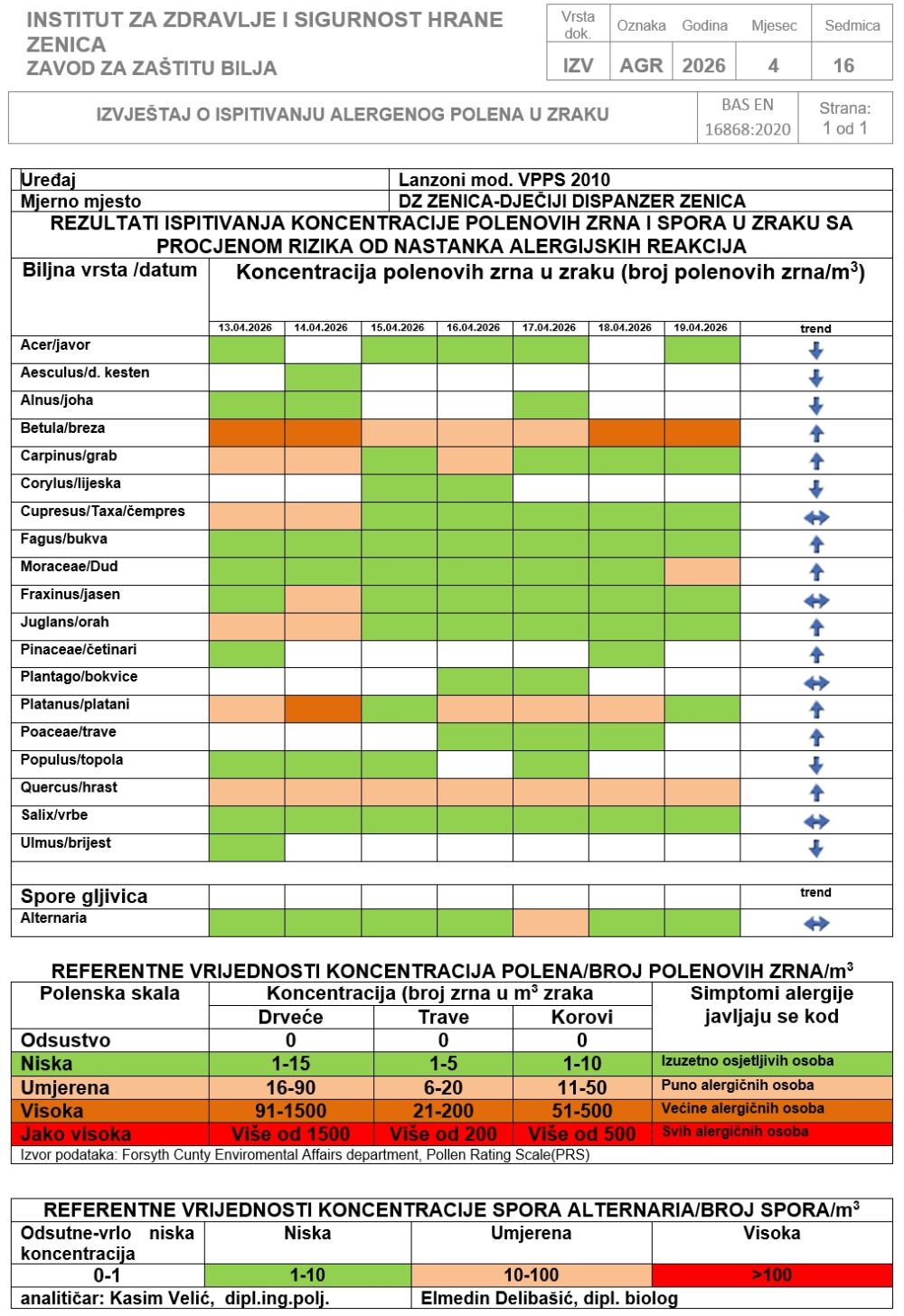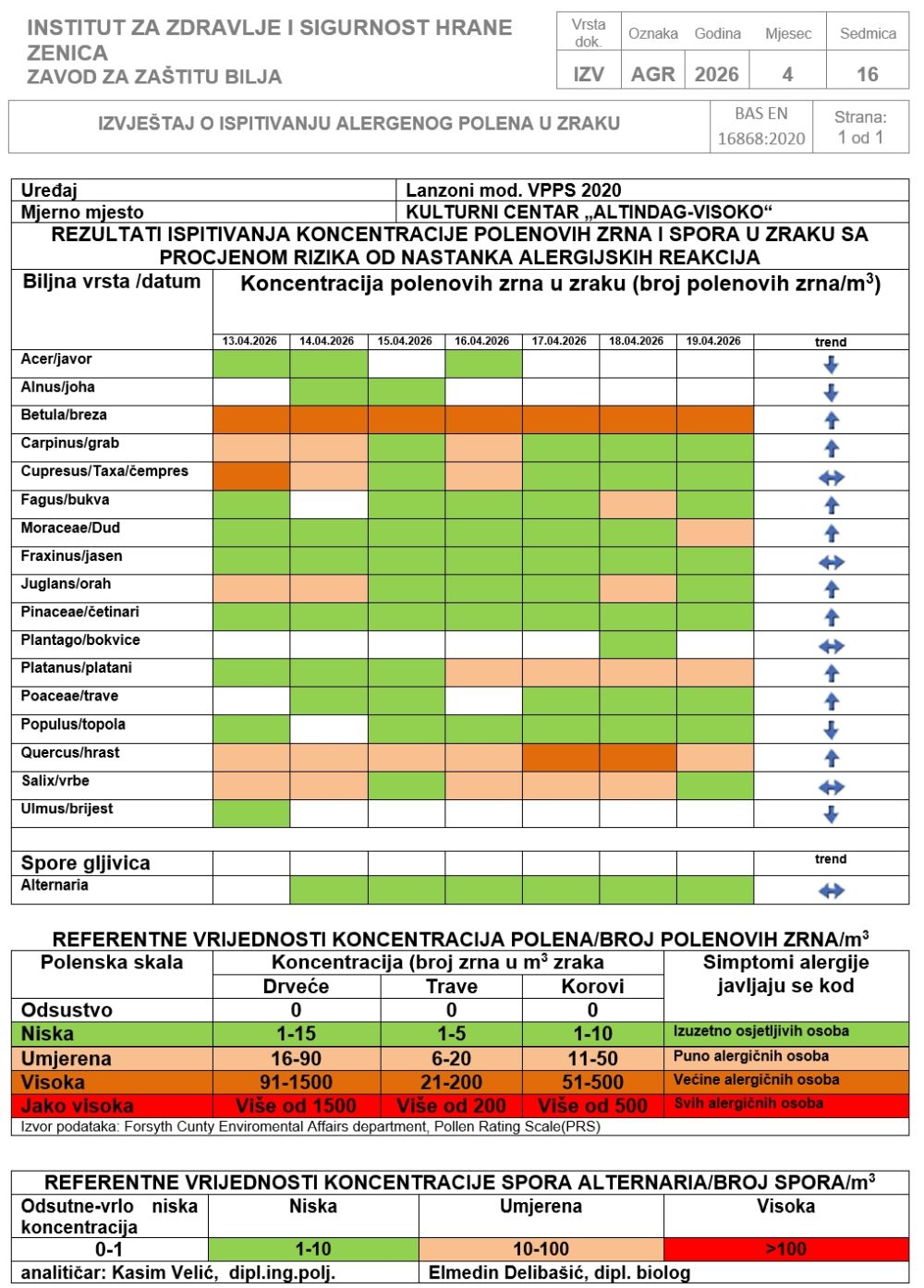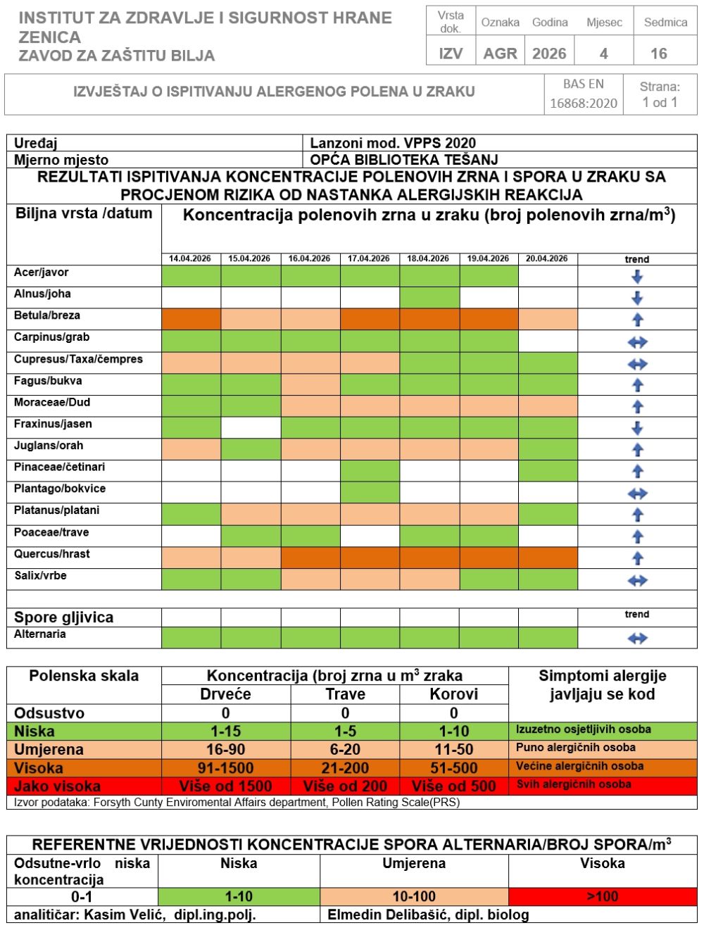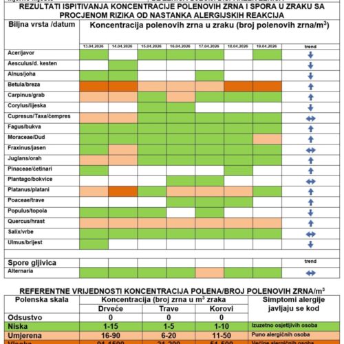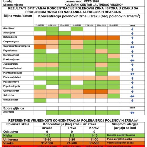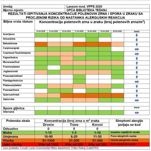Podaci sa mjernih stanica za polen Tešanj, Zenica i Visoko Za period: ponedjeljak, 13. april 2026. godine – nedjelja, 19. april 2026. godine