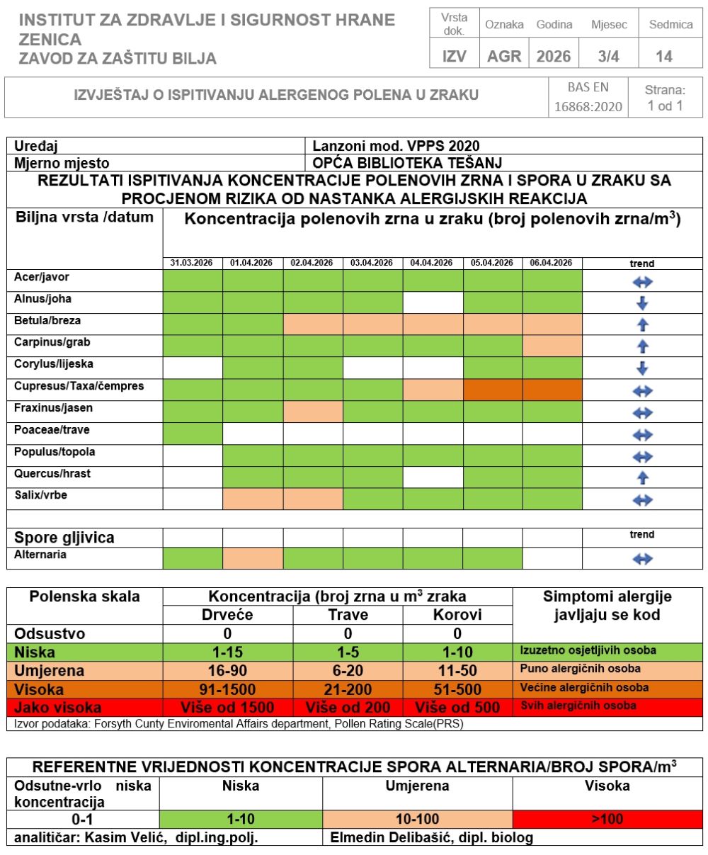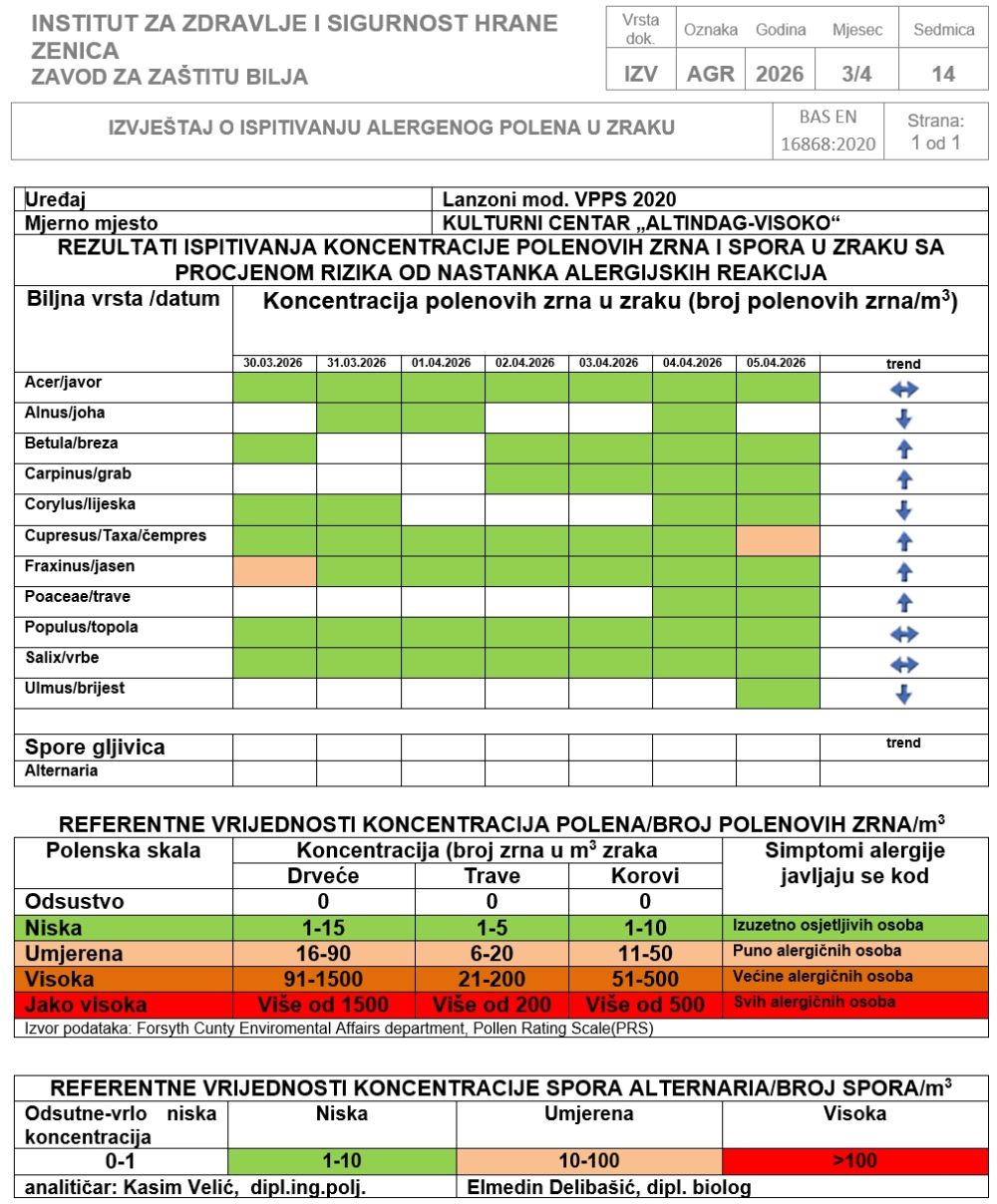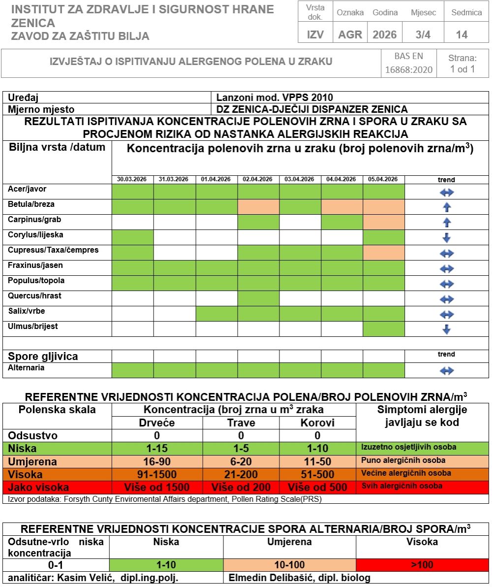 Zbog oborina i hladnog vremena polen jasena, čempresa i breze na mjernim stanicama u Visokom i Zenici kretao se na nivou niskih do blago umjerenih koncentracija, a osobe alergične na njihov polen su vjerojatno imali malo ili nimalo primjetnih simptoma.