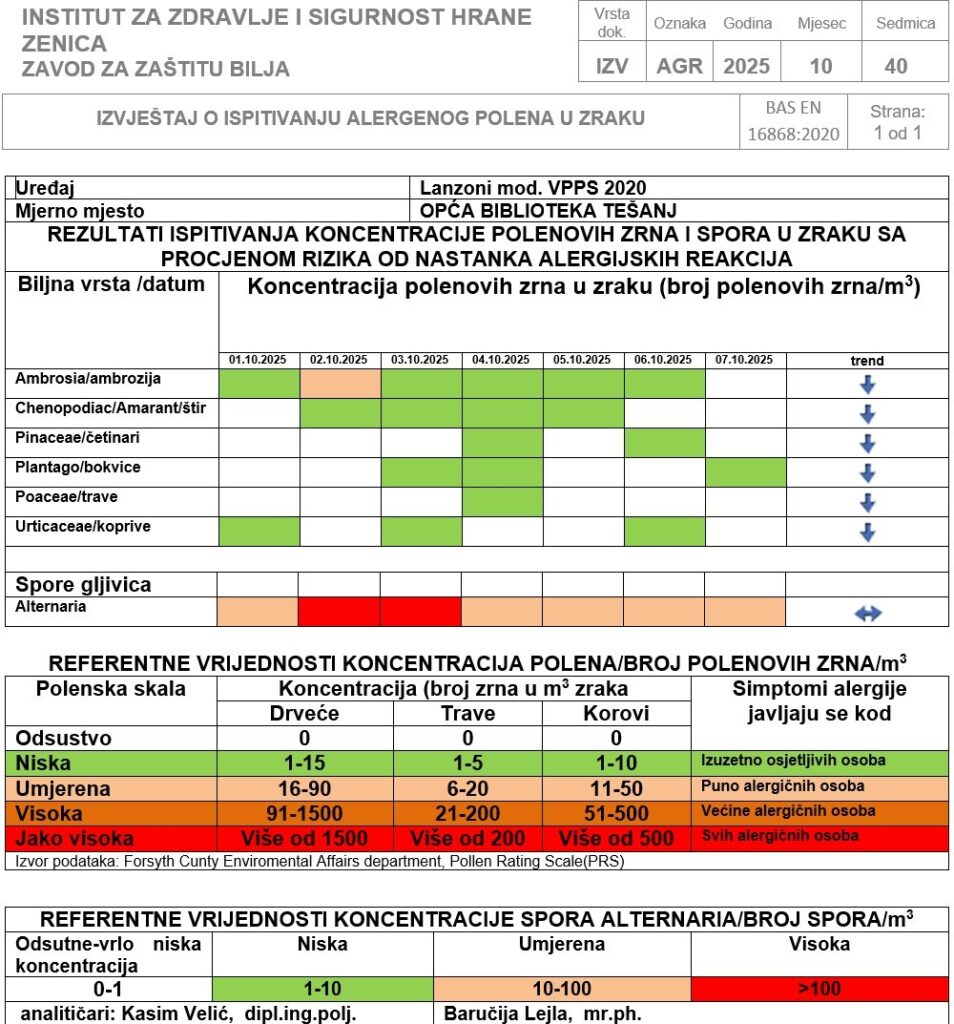 Tešanj: Izvještaj o ispitivanju alergenog polena u zraku od 01.10. do 07.10. 2025. godine