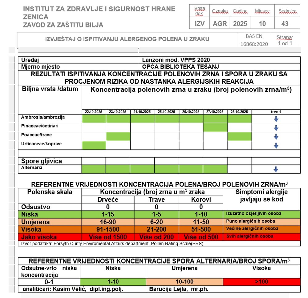 Tešanj: Izvještaj o ispitivanju alergenog polena u zraku od 22.10. do 28.10. 2025. godine