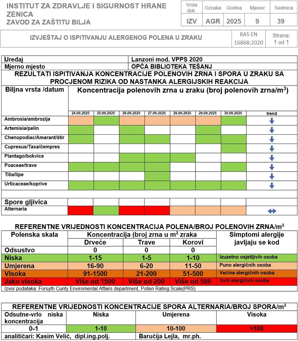Tešanj: Izvještaj o ispitivanju alergenog polena u zraku od 24.09. do 30.09. 2025. godine