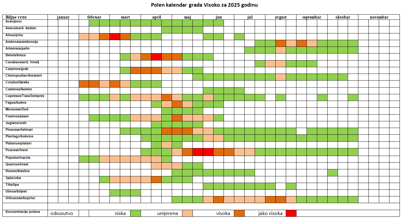 Polenski kalendar za mjernu stanicu Visoko razvijen je korištenjem podataka aerobiološkog praćenja iz 2025. godine Polenski kalendar grafički prikazuje razdoblja prisutnosti različitih anemofilnih vrsta polena u zraku tokom godine i povezane nivoe rizika.