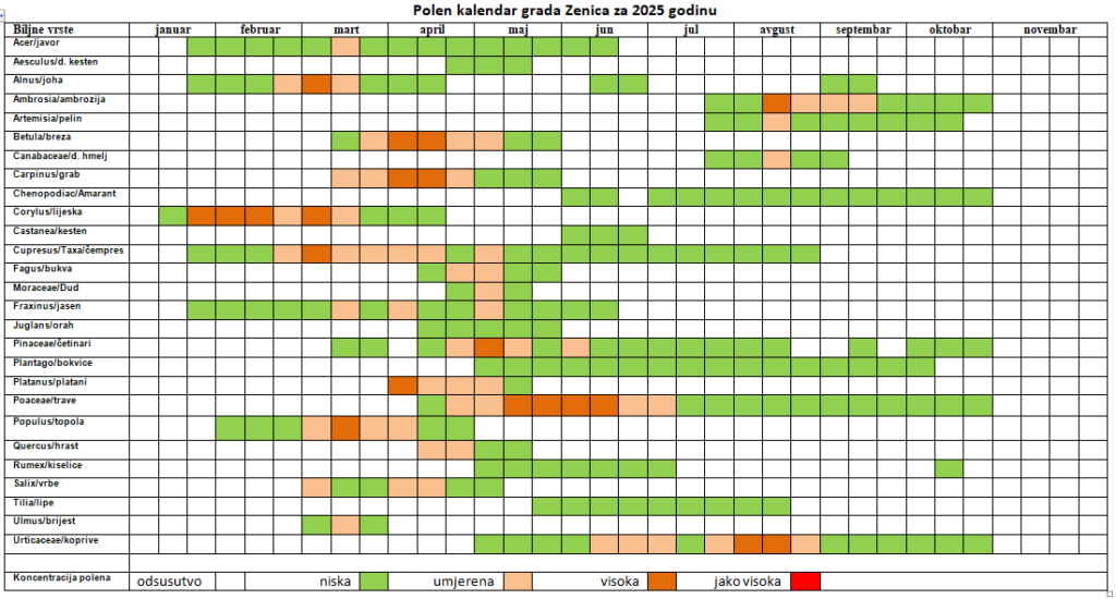 Sljedeći polenski kalendar za mjernu stanicu u zenici razvijen je korištenjem podataka aerobiološkog praćenja iz perioda 2020-2025. godine Polenski kalendar grafički prikazuje razdoblja prisutnosti različitih anemofilnih vrsta polena u zraku tokom godine i povezane nivoe  rizika.