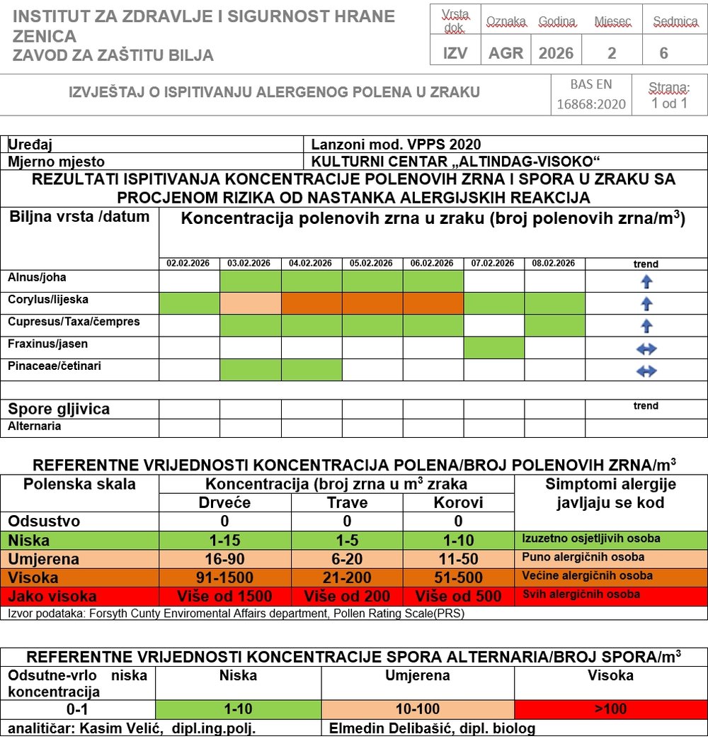 Visoko: Izvještaj o ispitivanju alergenog polena u zraku od 02.02. do 08.02. 2025. godine