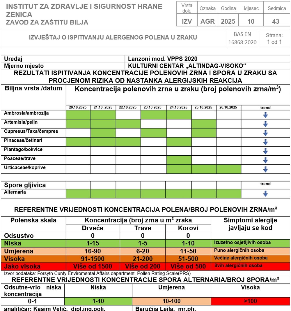 Visoko: Izvještaj o ispitivanju alergenog polena u zraku od 13.10. do 19.10. 2025. godine