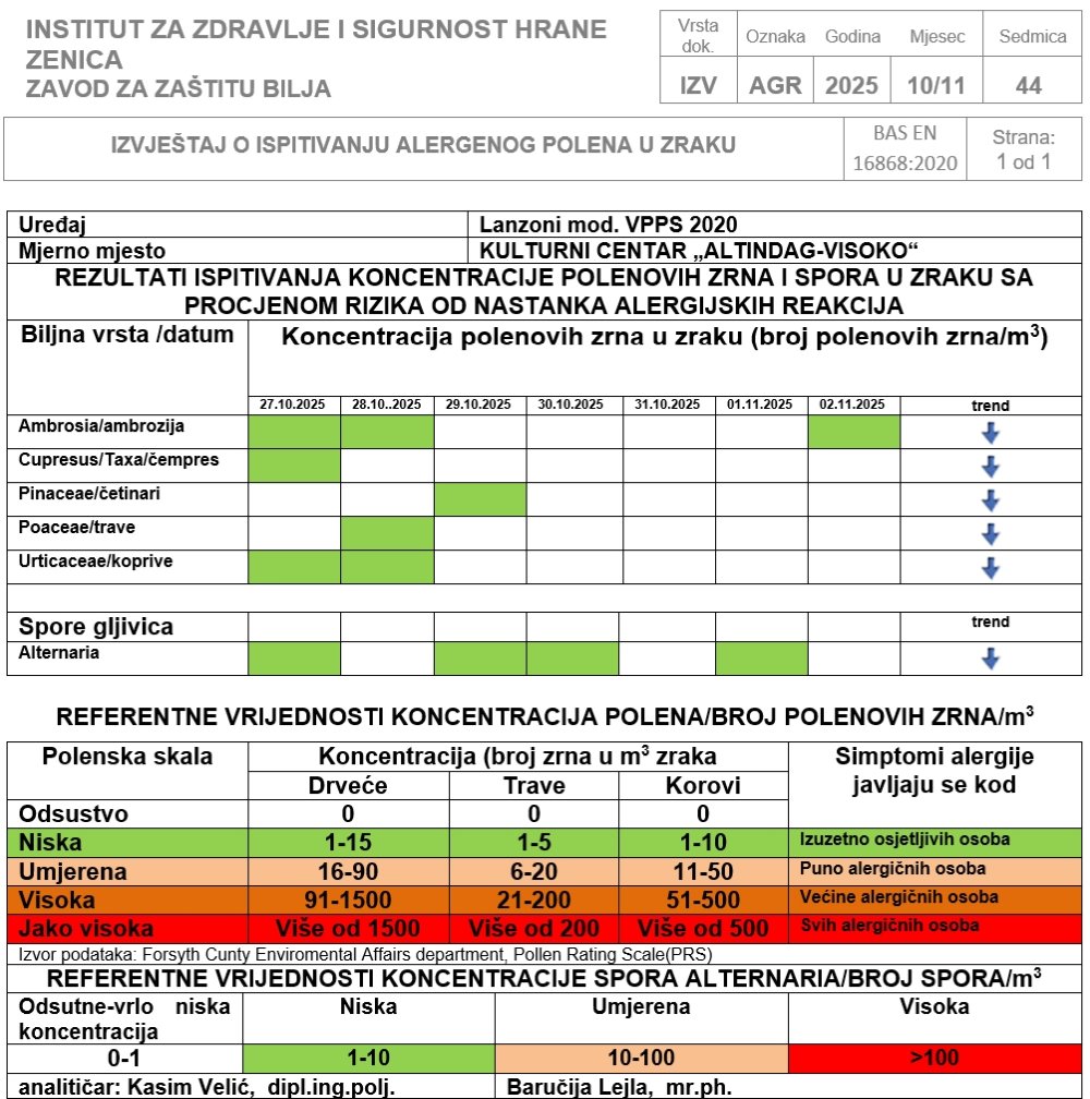 Visoko: Izvještaj o ispitivanju alergenog polena u zraku od 27.10. do 02.11. 2025. godine