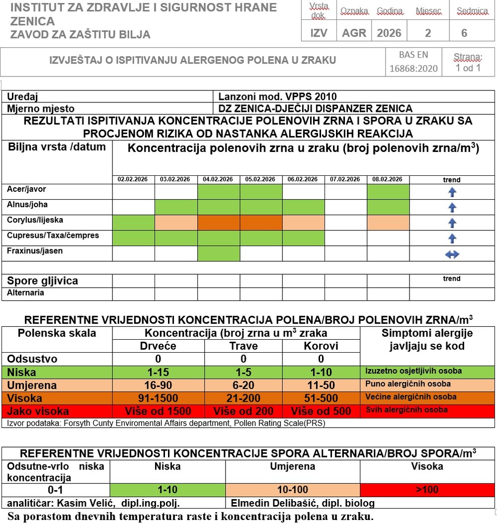 Zenica: Izvještaj o ispitivanju alergenog polena u zraku od 02.02. do 10.02. 2026. godine