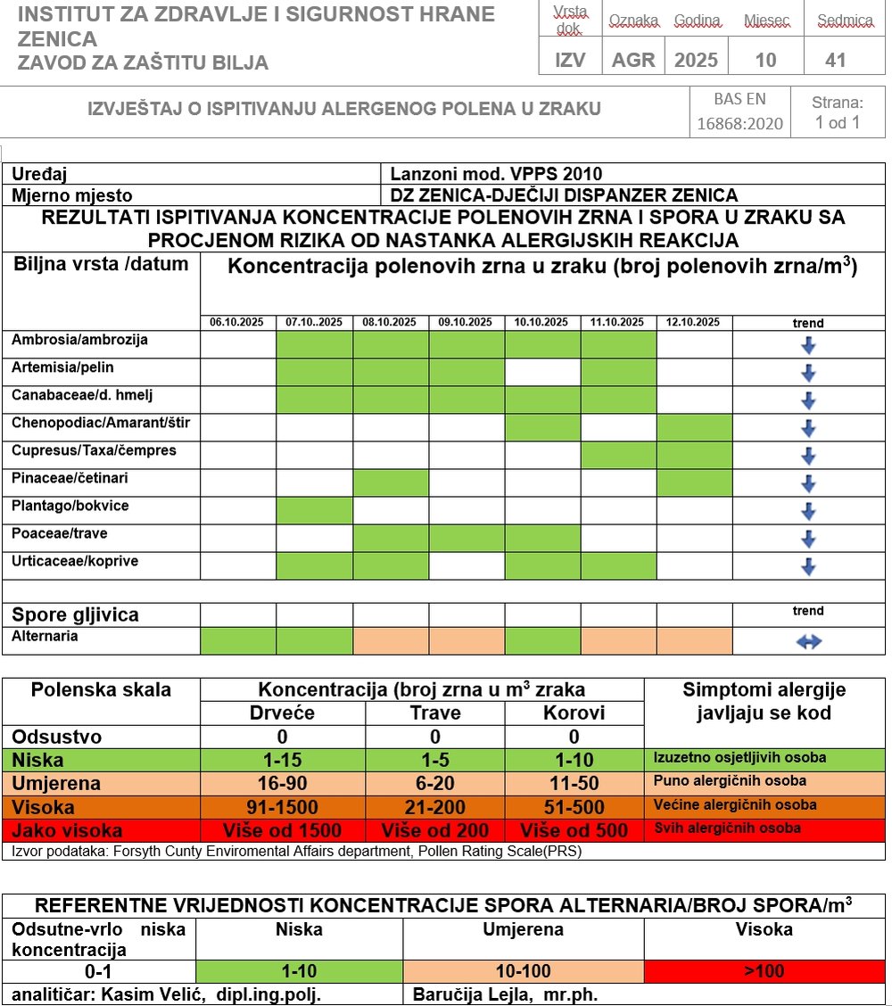 Zenica: Izvještaj o ispitivanju alergenog polena u zraku od 06.10. do 12.10. 2025. godine
