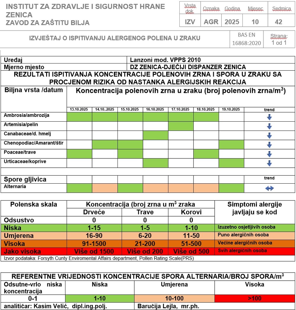 Zenica: Izvještaj o ispitivanju alergenog polena u zraku od 13.10. do 19.10. 2025. godine